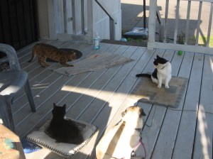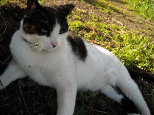 My brother-in-law called to say he was going to burn his brush pile and invited us over for the big event. I left the decision up to my son since he had homework to do…. Let’s Go, he said. We can see Domino! My brother-in-law knows how to build and feed a fire so it would be fun AND we would get to spend time with my Darling Domino. When we arrived, Chris was ready to go and Domino was taking a dirt bath. The men (my brother-in-law, his son and my son) were ready with the hose and ignited some paper. It started right away – Domino ran and took refuge behind a board that shelters the cut fire wood and only his head could be seen. He is just so darn cute. The fire was exceptional and didn’t produce too much smoke (no black smoke) and what smoke there was blew away from us so we were very pleased. As it burned down, they added more debris and monitored the perimeter with water. It was very exciting. Domino came and went but stopped by for kisses every pass through. After almost 3 hours, we decided to head home so I called him to say good-bye. Apparently he wasn’t very close (or was ignoring me) so my nephew got the bell he has trained Domino with and within just a couple of minutes Domino could be seen racing back towards the house from quite a distance. He of course didn’t want to miss the opportunity for some kibble…..I had a bowl for him but insisted on holding him and kissing him before he got it – then Wille wanted to do the same. He was extremely tolerant of this and his purrs could be heard from 8 feet away. I so love this cat and am amazed at how he still comes for dinner – now it is just with a bell rather than a call from across the street. He has to be the happiest cat on the planet – his dreams have finally come true.
